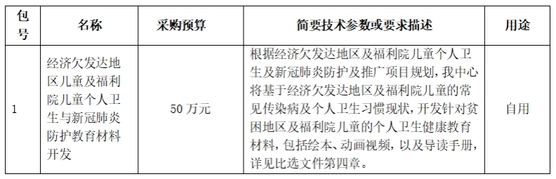 中国健康教育中心就“经济欠发达地区儿童及福利院儿童个人卫生与新冠肺炎防护教育材料开发”进行比选采购,现邀请合格供应商参加比选响应。