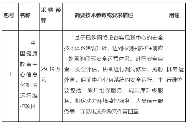 中国健康教育中心就 “中国健康教育中心信息化机房运行维护项目”进行比选采购,现邀请合格供应商参加比选响应。