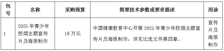 中国健康教育中心 “2025年青少年控烟主题宣传片及海报制作进行比选采购,现邀请合格供应商参加比选响应。