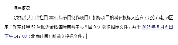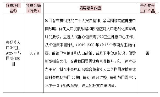 中国健康教育中心央视《人口》栏目2025年节目制作项目公开招标公告