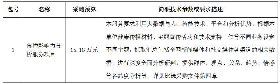 中国健康教育中心就 “传播影响力分析服务项目”进行比选采购,现邀请合格供应商参加比选响应。