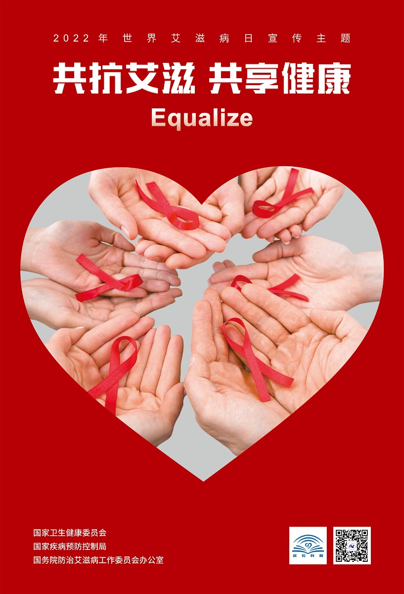 2022年12月1日是第35个“世界艾滋病日”,今年我国宣传活动主题为“共抗艾滋 共享健康”(英文主题为“Equalize”)。受国家疾控局委托,中国健康教育中心开发设计了今年“世界艾滋病日”主题海报,已于近期正式发布,欢迎传播使用。