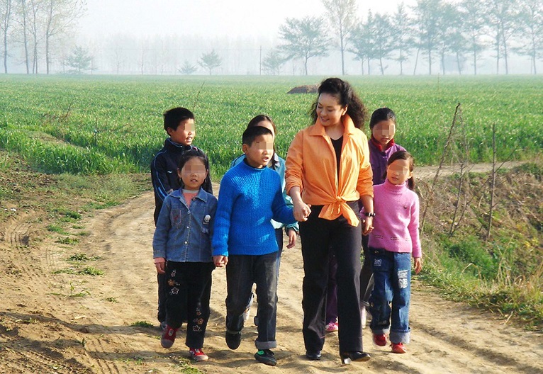 2009年,彭丽媛参加禁毒防艾边疆行活动时同受艾滋病影响儿童在一起