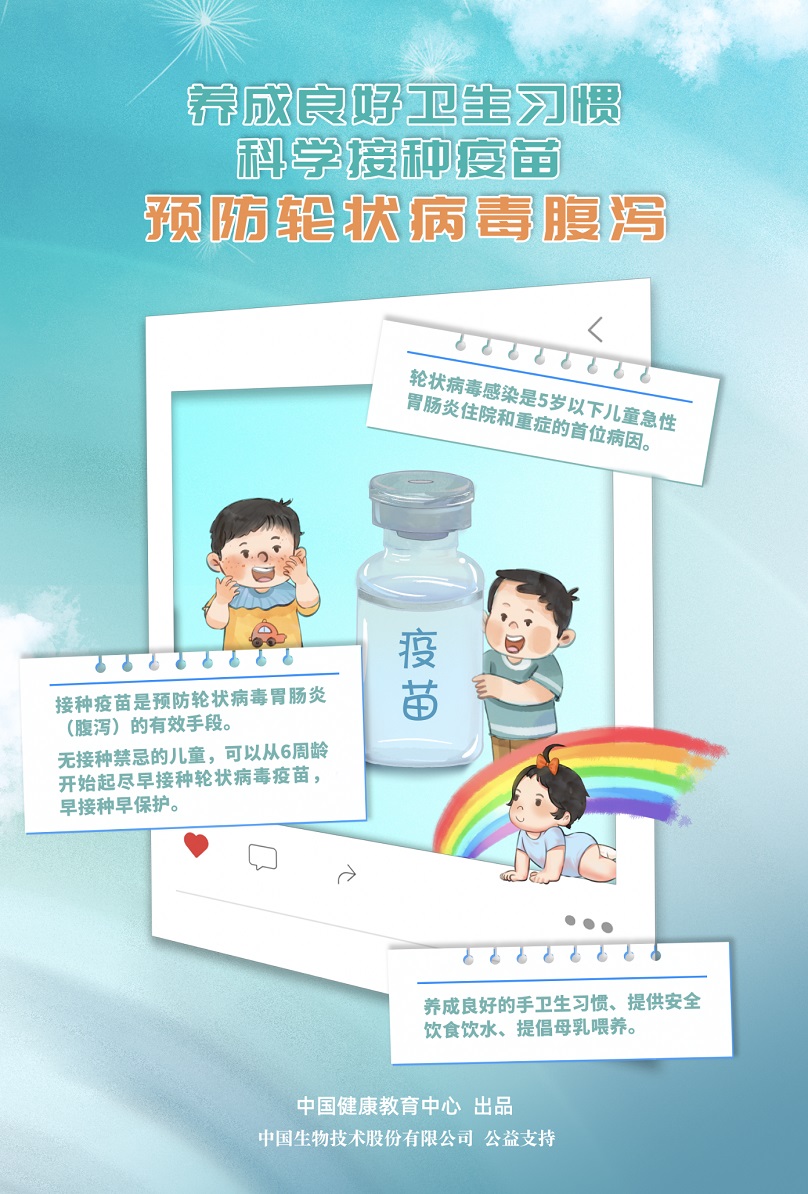 为进一步做好传染病防控健康教育,提升公众的健康素养,倡导健康生活方式,中国健康教育中心将开发预防传染病系列海报,现发布“养成良好卫生习惯 科学接种疫苗 预防轮状病毒腹泻”主题海报现,欢迎传播使用。