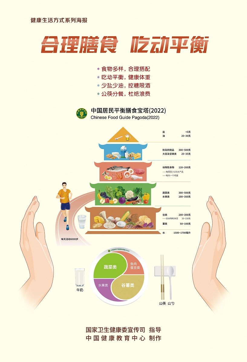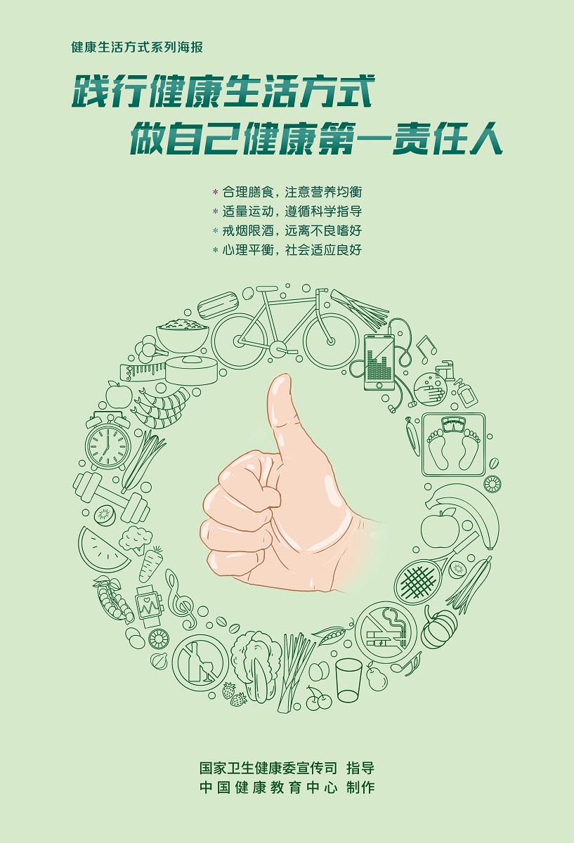 2022年9月1日是第16个“全民健康生活方式行动日”,每年的9月也是健康生活方式月。在国家卫生健康委宣传司指导下,中国健康教育中心设计开发了健康生活方式主题系列海报,一套五张,内容涵盖“做自己健康第一责任人”,以及健康四大基石——合理膳食、适量运动、戒烟限酒、心理平衡。为了自己和家人的健康幸福,让我们选择健康生活方式,行动起来!