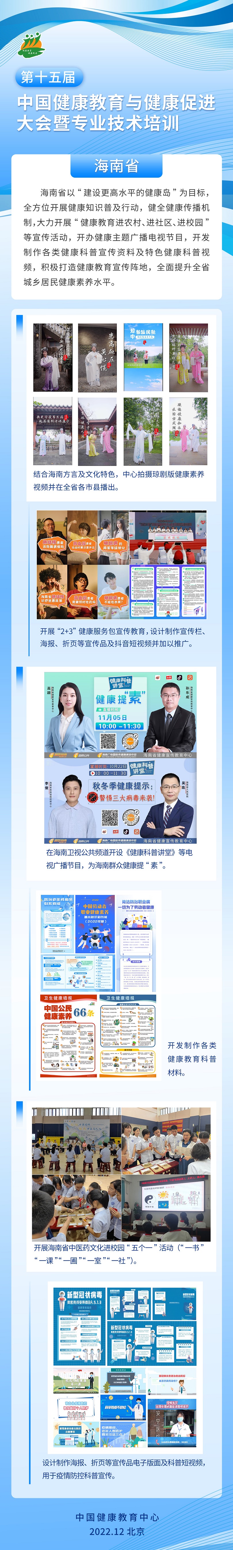 2022年,全国各地积极开展健康教育、健康促进和卫生健康新闻宣传工作,涌现出很多亮点、特色和经验。值此第十五届中国健康教育与健康促进大会暨专业技术培训举办之际,中国健康教育中心组织各省级健康教育机构对2022年重点工作进行了梳理,旨在交流分享,不断推动健康教育工作高质量发展。